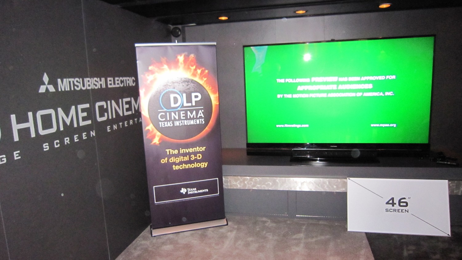 Hinter der "Pappe" steht auf einem Podest der neue MITSUBISHI Rückprofernseher mit 92 Zoll Bilddiagonale.
