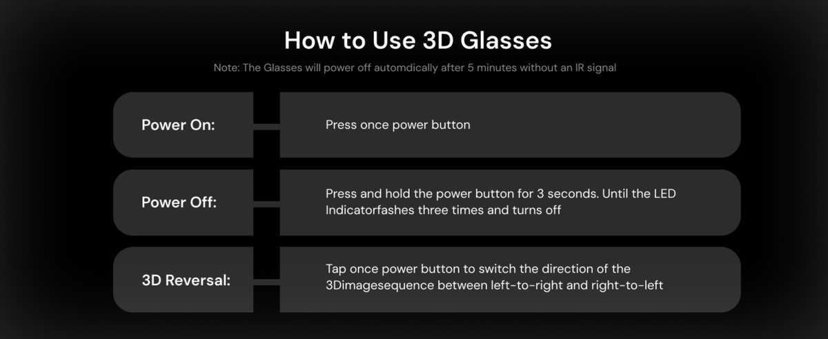 Ein integrierter Auto-Standby-Chip erkennt, wenn der Projektor ausgeschaltet wird, und versetzt die Brille automatisch in den Energiesparmodus. Das schont den Akku und verlängert die Lebensdauer. Mit USB-Ladekabel ist die Brille in kurzer Zeit wieder einsatzbereit.