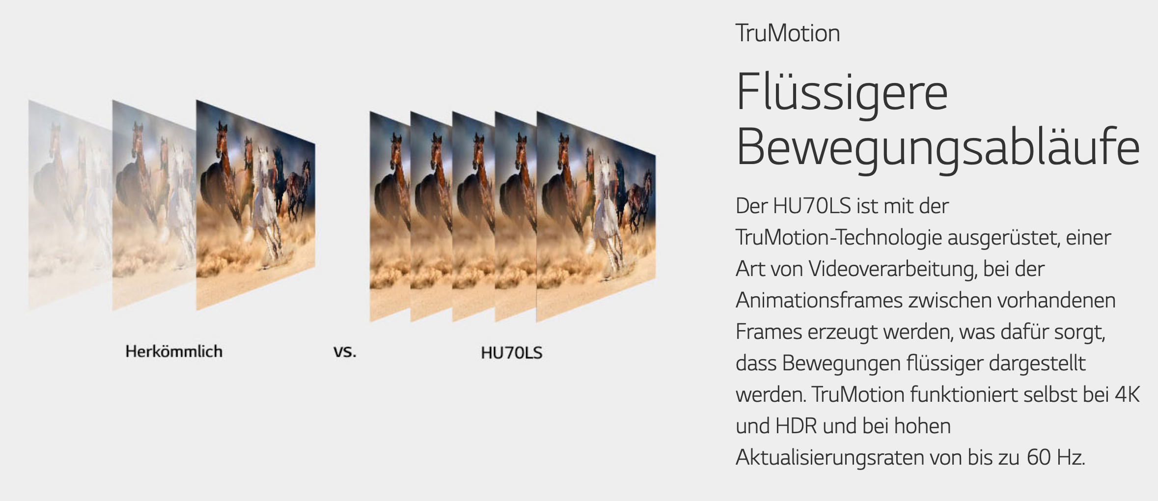 Mit LAN und WLAN ist der Projektor schnell im Netz und versorgt die SmartTV-Apps mit Daten, dazu stellt er alle freigegebenen Dateien aus dem Heimnetzwerk proaktiv auf der SmartShare-Oberfläche (webOS 4.5 mit Quad Core-Prozessor) zur Verfügung. Zudem bringt er beste Heimkino-Features mit: Er glänzt mit einer mehrstufigen TruMotion-Zwischenbildberechnung, elektronisch gesteuertem Focus und 1,25 fach Zoom. Zudem spiegelt er Ihre Smartphone Inhalte und unterstützt Dolby Atmos und auch Bluetooth.