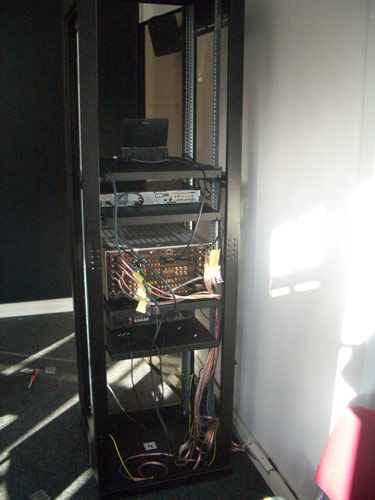 Die gesamte Technik wurde in einem konsequenterweise schwarzem Serverschrank untergebracht. Da alle Wände abnehmbar sind, ist die Verkabelung sehr bequem und ohne Verrenkung möglich.