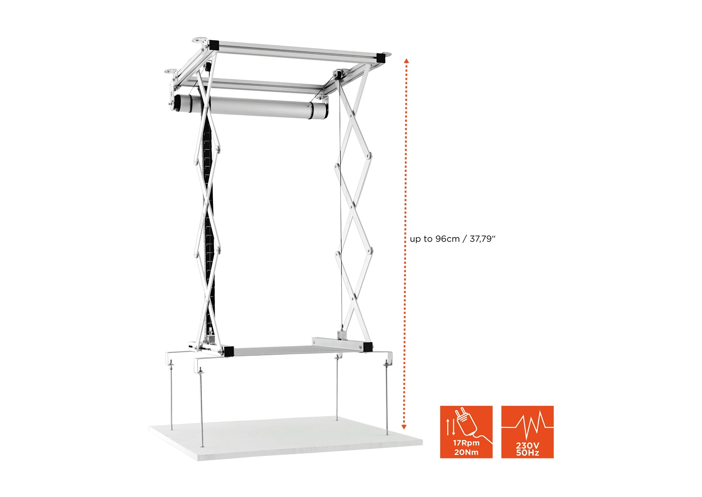 Deckenlift für Projektoren bis 30 kg mit 96 cm Hub, integrierter Kabelführung und leisem Motor für flexible und unsichtbare Installation in Decken
