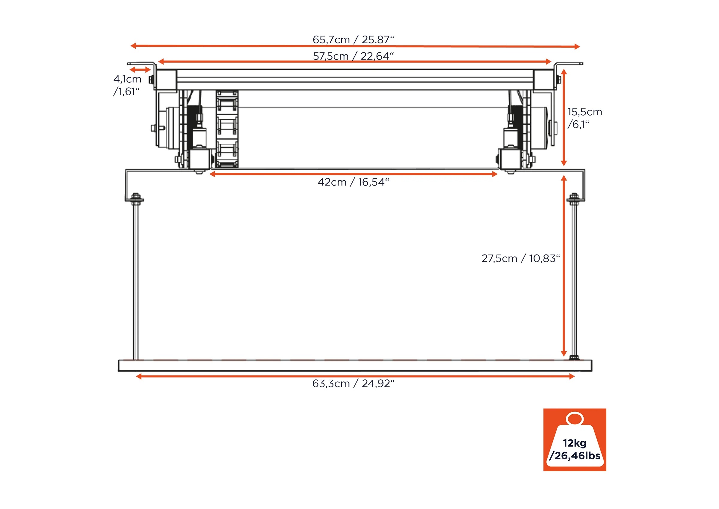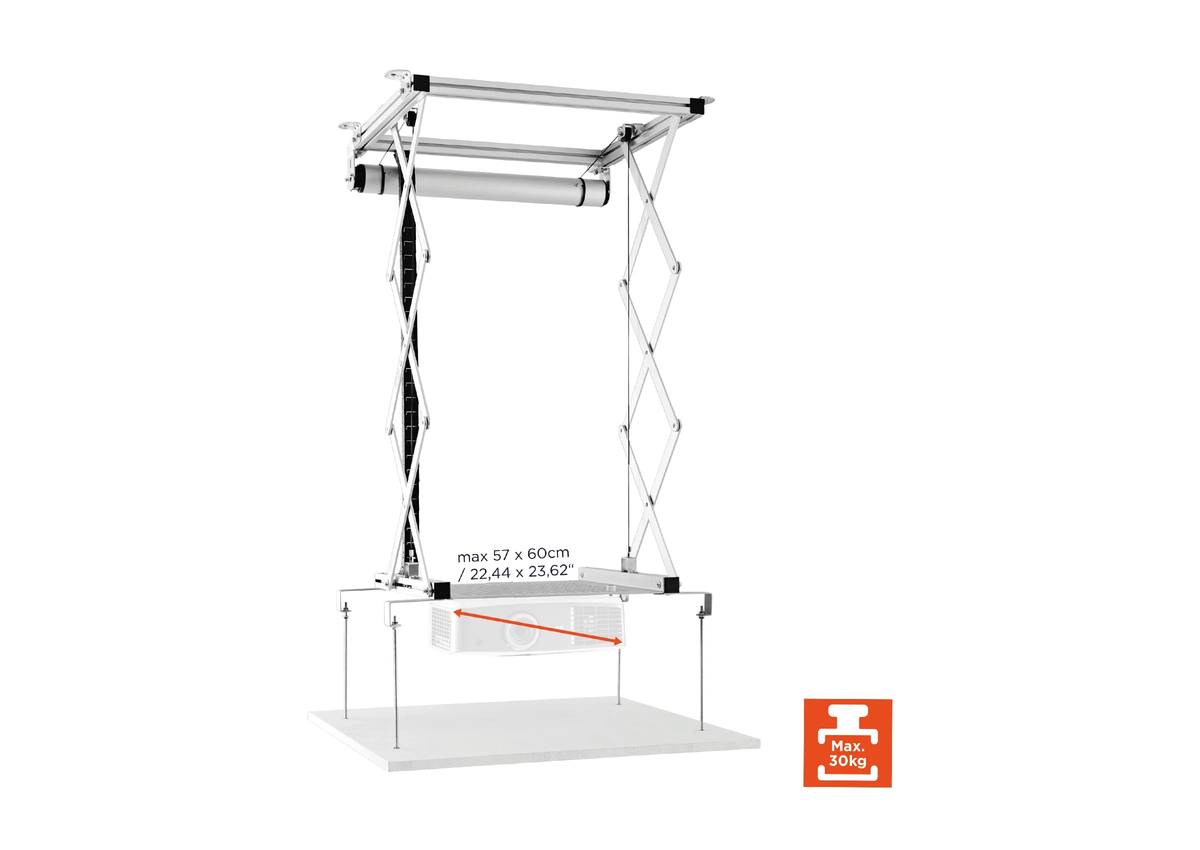 Der celexon PL1000 Plus ist für Projektoren bis zu 30 kg ausgelegt und bietet damit deutlich mehr Leistungsreserven als viele vergleichbare Deckenlifte. Auch größere Geräte mit Abmessungen bis zu 57 x 60 cm lassen sich problemlos integrieren.