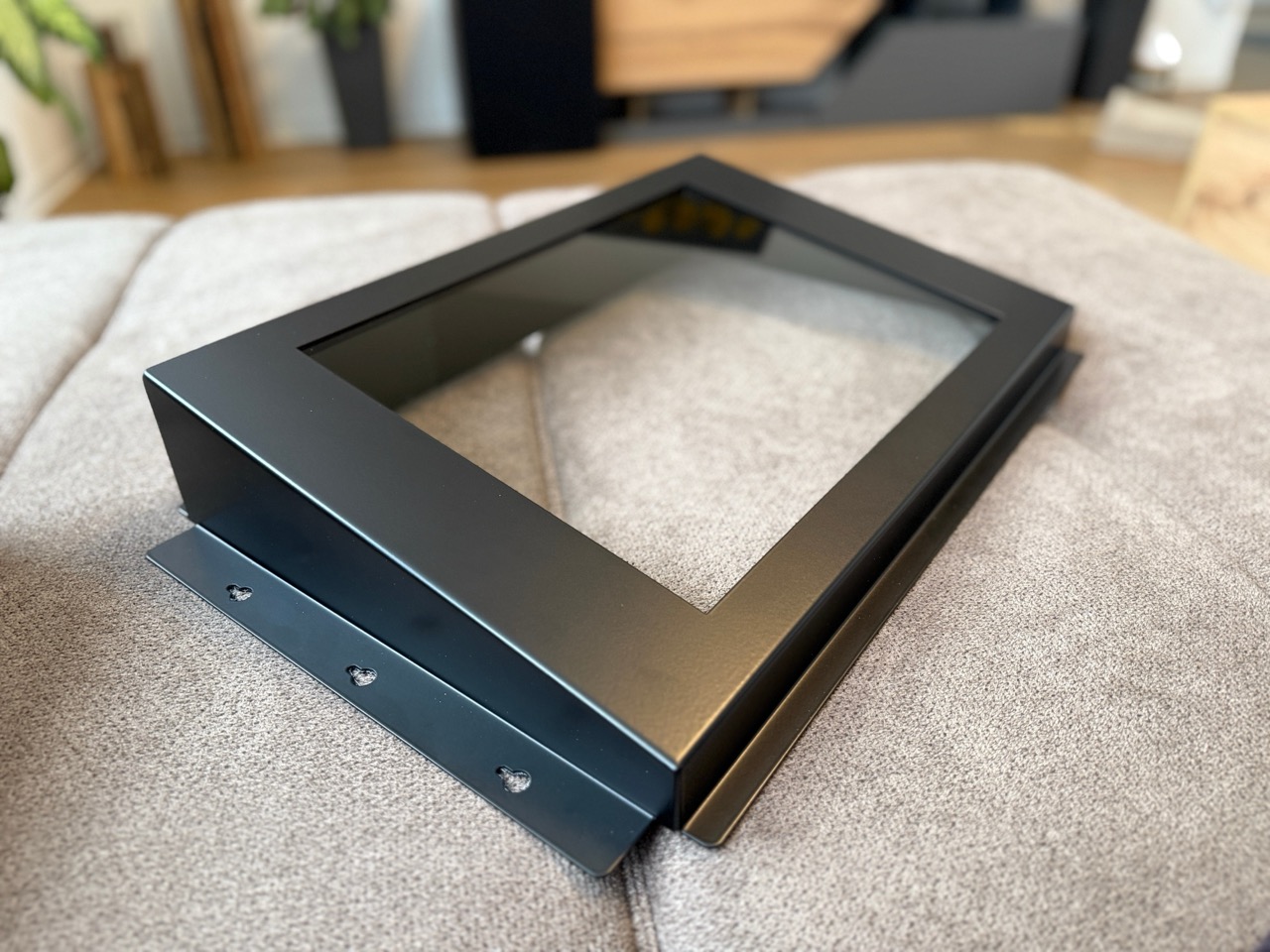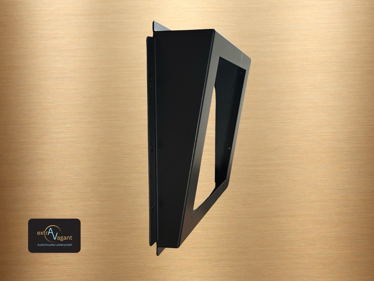 Das CinemAVision Projektionsglas-Set wird gebrauchsfertig vormontiert geliefert. Die Halterung ist schwarz pulverbeschichtet und fügt sich mit ihrer dezenten Optik sehr gut in Technikräume, Verkofferungen und Heimkino-Umgebungen ein. Besonders praktisch ist die clevere Aufhängung: Sie erleichtert Montage und Demontage – zum Beispiel, wenn das Glas zur Reinigung abgenommen werden soll.