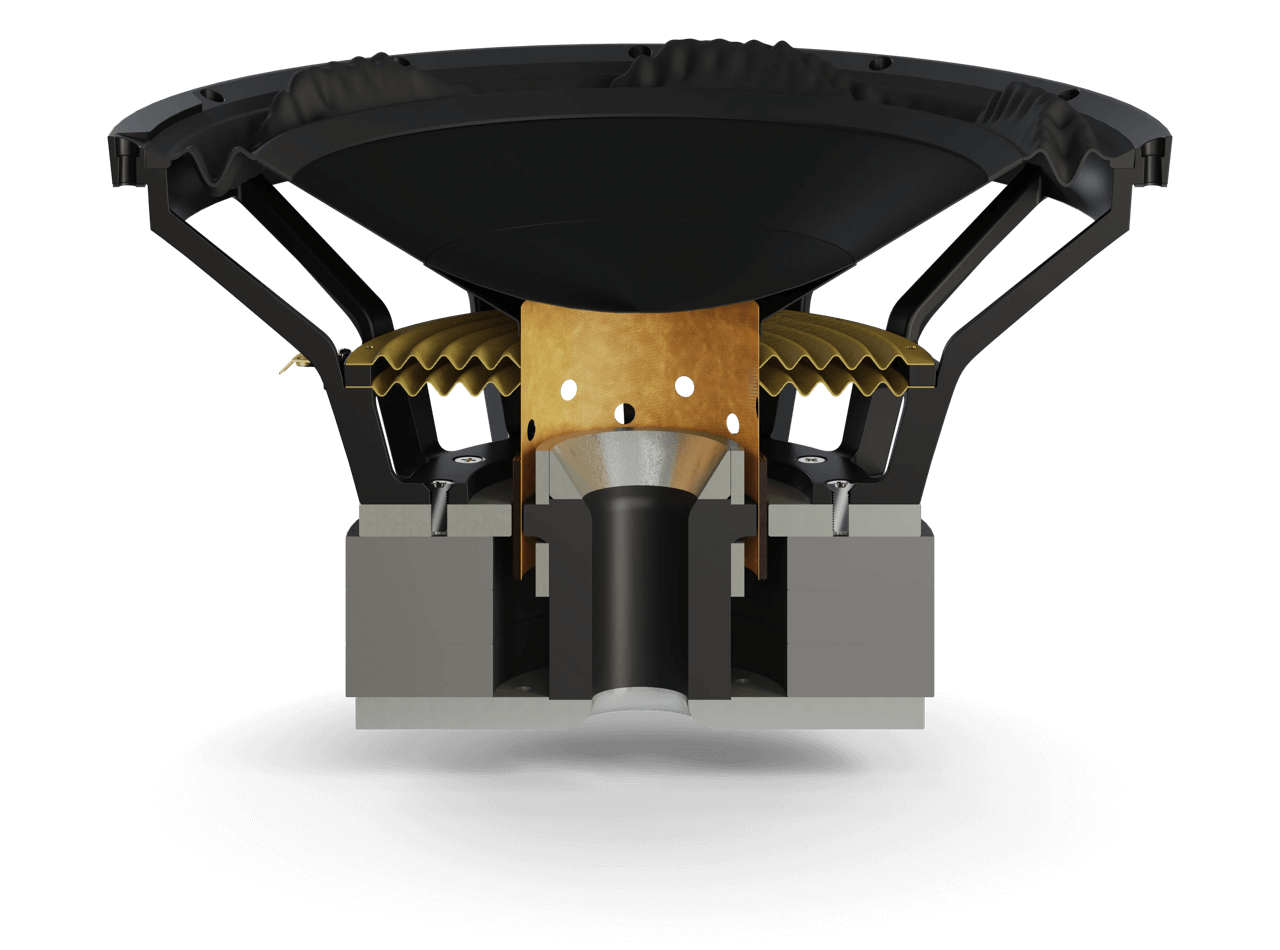 Der Treiber arbeitet mit hoher Bandbreite und sehr geringer Verzerrung über den gesamten Arbeitsbereich. Die Constant Surface Surround (CSS) Sicke hält die effektive Membranfläche selbst bei großen Auslenkungen konstant, reduziert Eigenresonanzen und verbessert die Linearität. Ein Hub von bis zu 70 mm (Peak-to-Peak) und das größte je bei DALI eingesetzte Ferrit-Magnetsystem sorgen für enorme Leistungsreserven ohne hörbare Kompression.