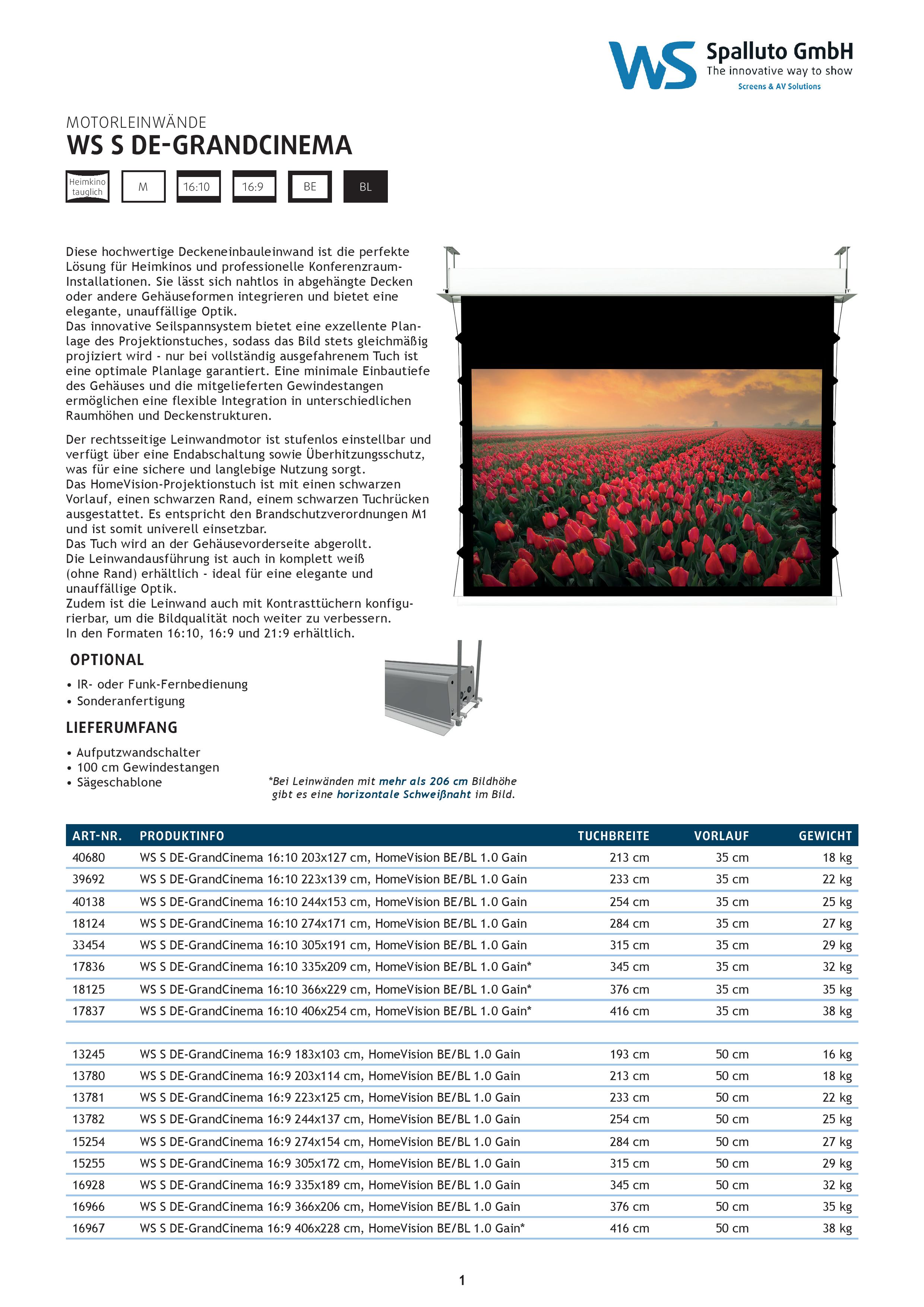 WS S DE-GrandCinema Deckeneinbauleinwand 16:9 – Premium Motorleinwand für Heimkino und Wohnzimmer