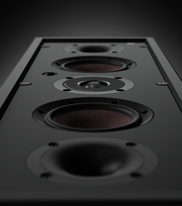 Die Schallwand und der Rand der PHANTOM M-250 sind mattschwarz lackiert. Damit keine Reflexionen des Projektorlichts die Wiedergabe stören, gibt es keinerlei glänzenden Flächen an der Front. Das Abdeckgitter haftet magnetisch und lässt sich bei Bedarf vollständig in der gewünschten Farbe kolorieren, damit sich die Lautsprecher unauffällig ins Wohnambiente integrieren.