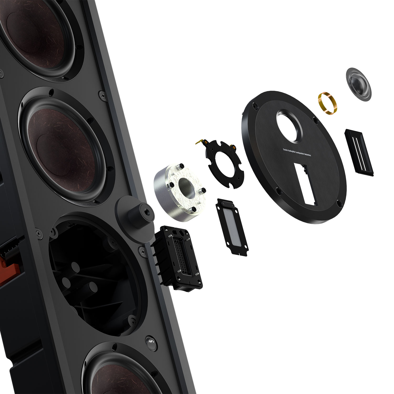 Der übergroße 28-mm-Kalottenhochtöner wird ebenfalls im eigenen Haus gefertigt und ist für eine hohe Belastbarkeit und nahtlose Integration in den Mitteltonbereich ausgelegt.