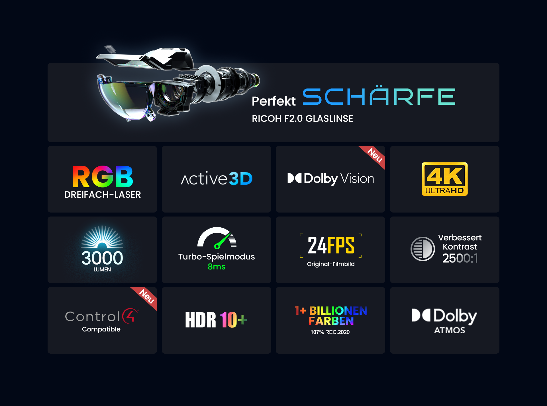 Mit Dolby Vision ist der AWOL der einzige RGB UST-Projektor auf dem Markt, der Dolby Vision, HDR 10 , Dolby Atmos und Active 3D bietet.