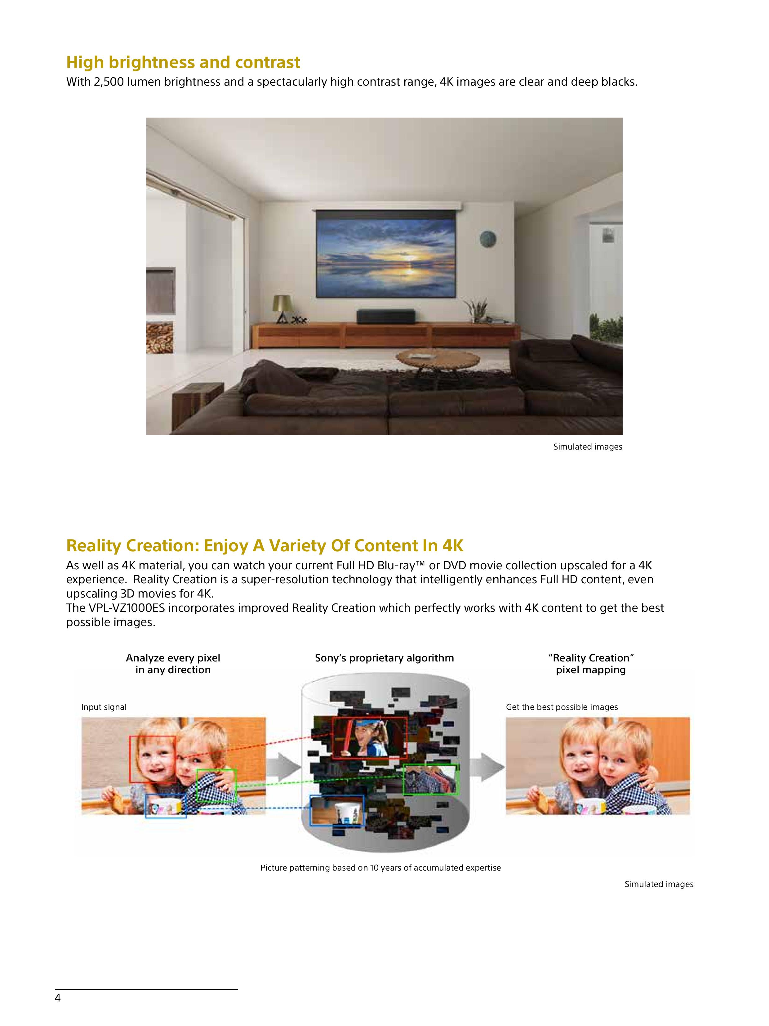 Der VPL-VZ1000ES kann Ultra HD-Inhalte bei bis zu 60 Bildern/s (4K 60p YCbCr 4:2:2 8 Bit/YCbCr 4:2:2 12 Bit) anzeigen und erreicht somit noch flüssigere Bilder mit herausragenden Farben und hohem Realismus. Dank der Unterstützung für HDCP 2.2 können Sie die neuesten 4K-Inhaltsdienste nutzen.