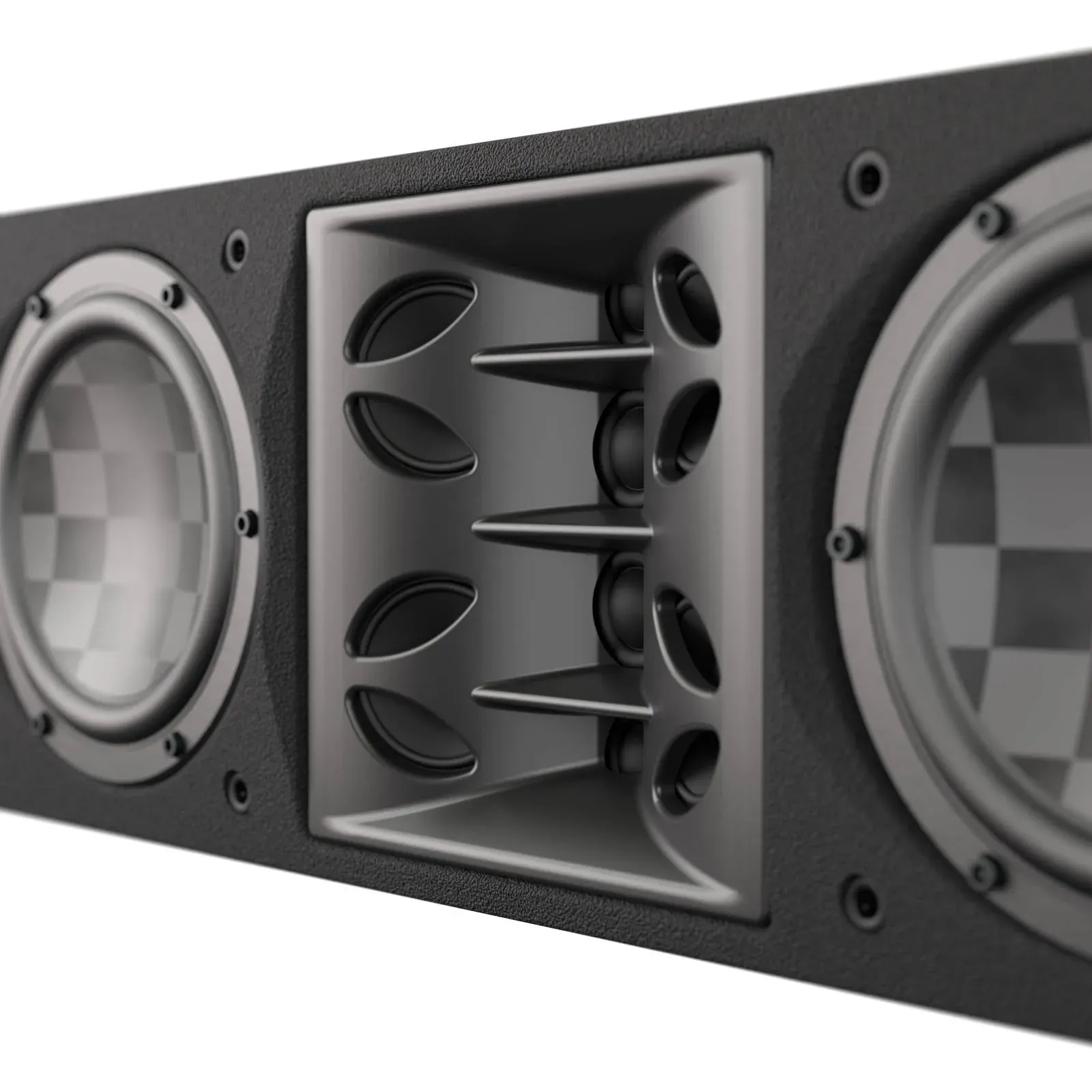 Schlanker 3-Wege Heimkino-Screenlautsprecher mit AMT-Hochtöner, TeXtreme® 6,5" Treibern, 45 Hz–24 kHz, 4 Ohm, empfohlen 300 W, drehbarer MHF-Sektion