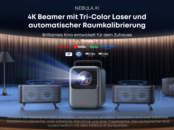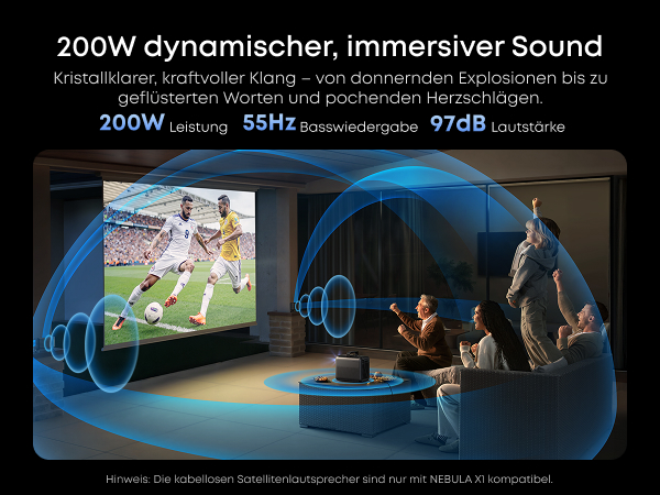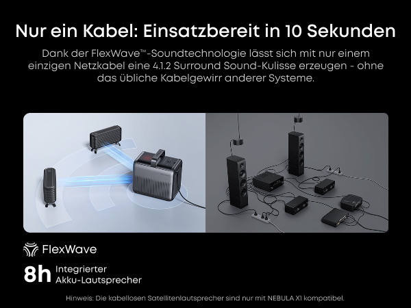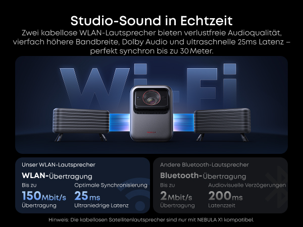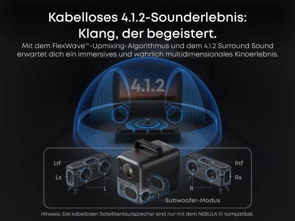 * 4.1.2 Surround Sound mit kabellosen Satellitenlautsprechern: Verbinden die kabellosen Satellitenlautsprecher mit dem NEBULA X1 und erlebe immversiven 4.1.2 Surround Sound mit kraftvollen 160W.