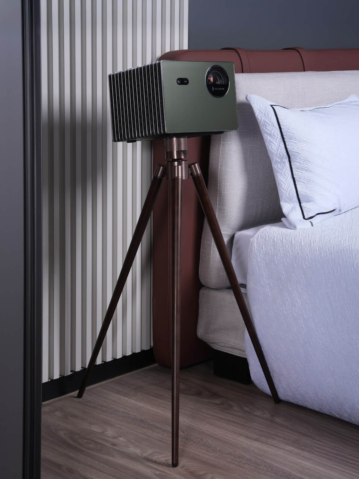 Mit seiner dunklen Walnuss-Holzoptik und den hellbraunen Metallteilen wirkt das Valerion Stativ edel und modern zugleich. Es fügt sich perfekt in anspruchsvolle Heimkino- oder Studio-Umgebungen ein und bietet eine stilvolle Alternative zu klassischen Projektor-Halterungen.