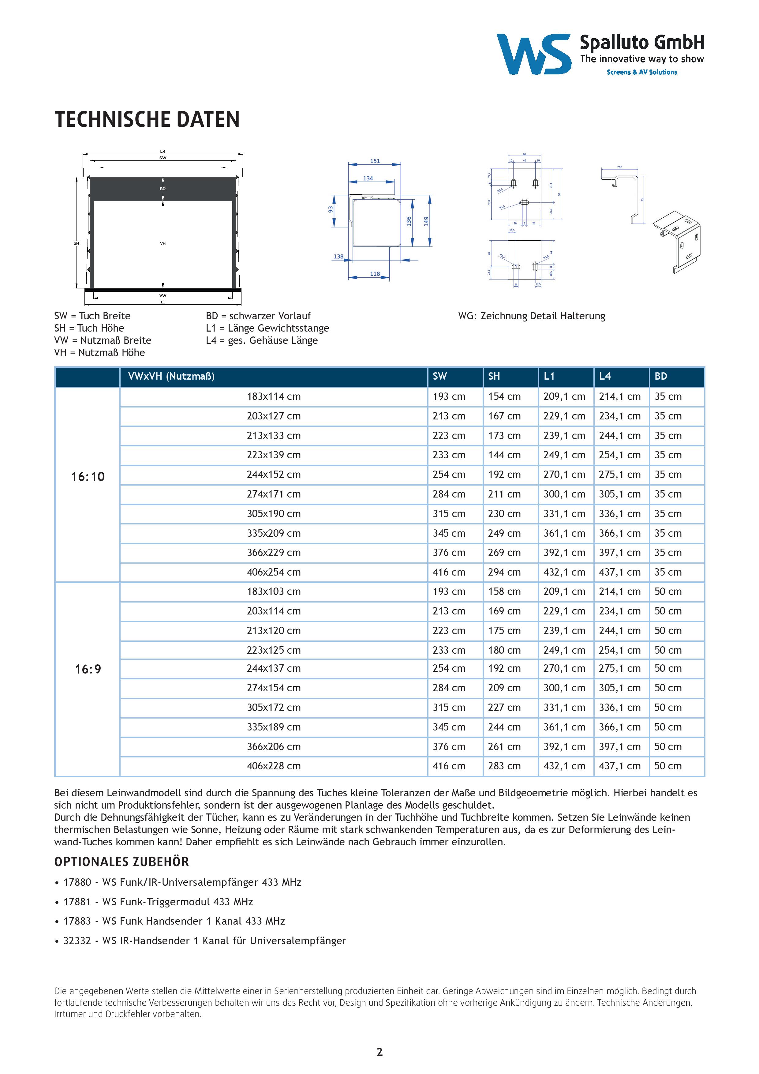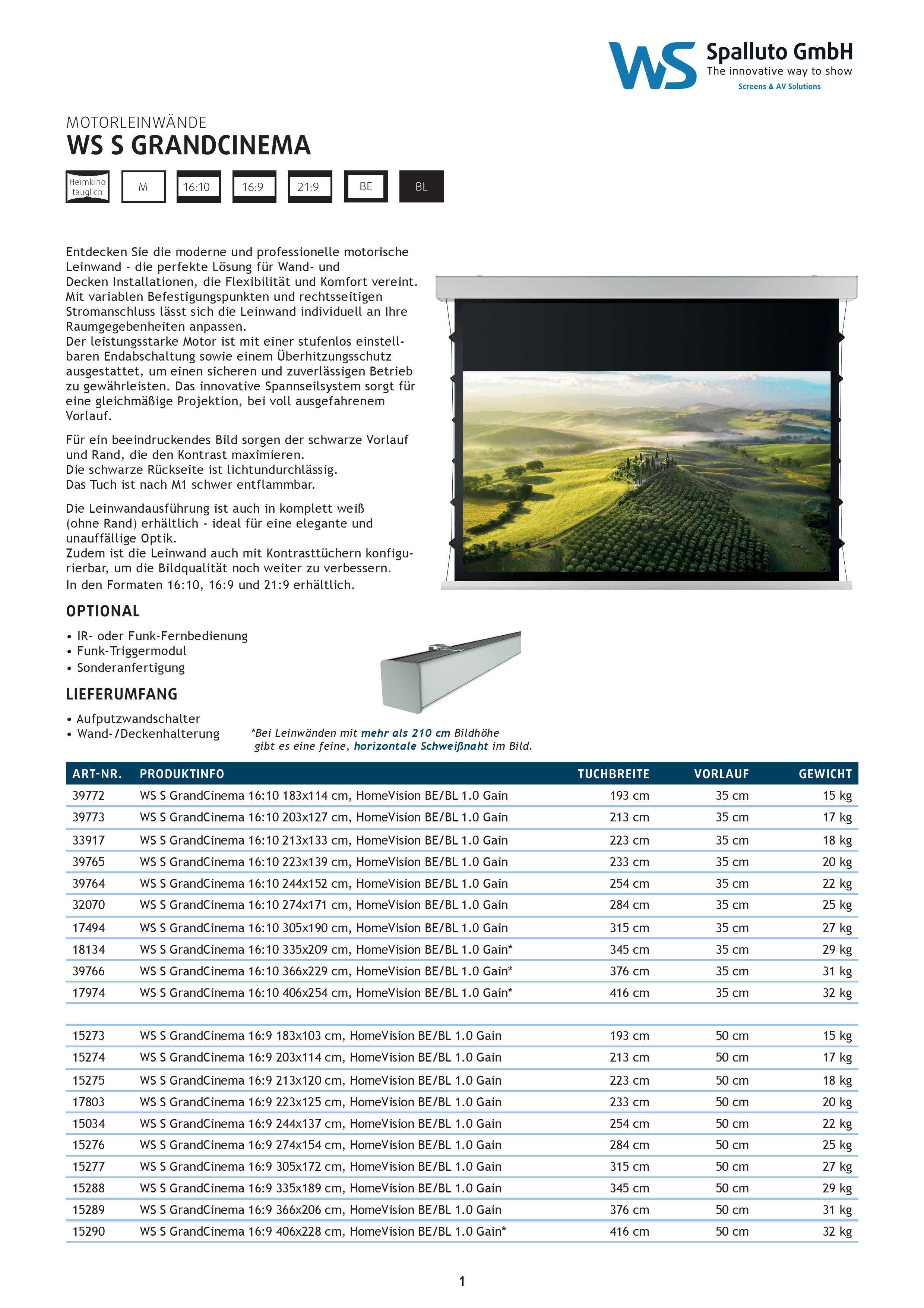 Die WS S GrandCinema im 16:9 Bildformat ist mehr als nur eine Leinwand – sie ist die Grundlage für ein professionelles Heimkino-Erlebnis. Die Kombination aus hochwertigem Gain 1.0 Tuch, schwarzem Maskierungsrahmen, innovativem Spannsystem und komfortabler Motorisierung macht sie zur ersten Wahl für anspruchsvolle Filmfans.