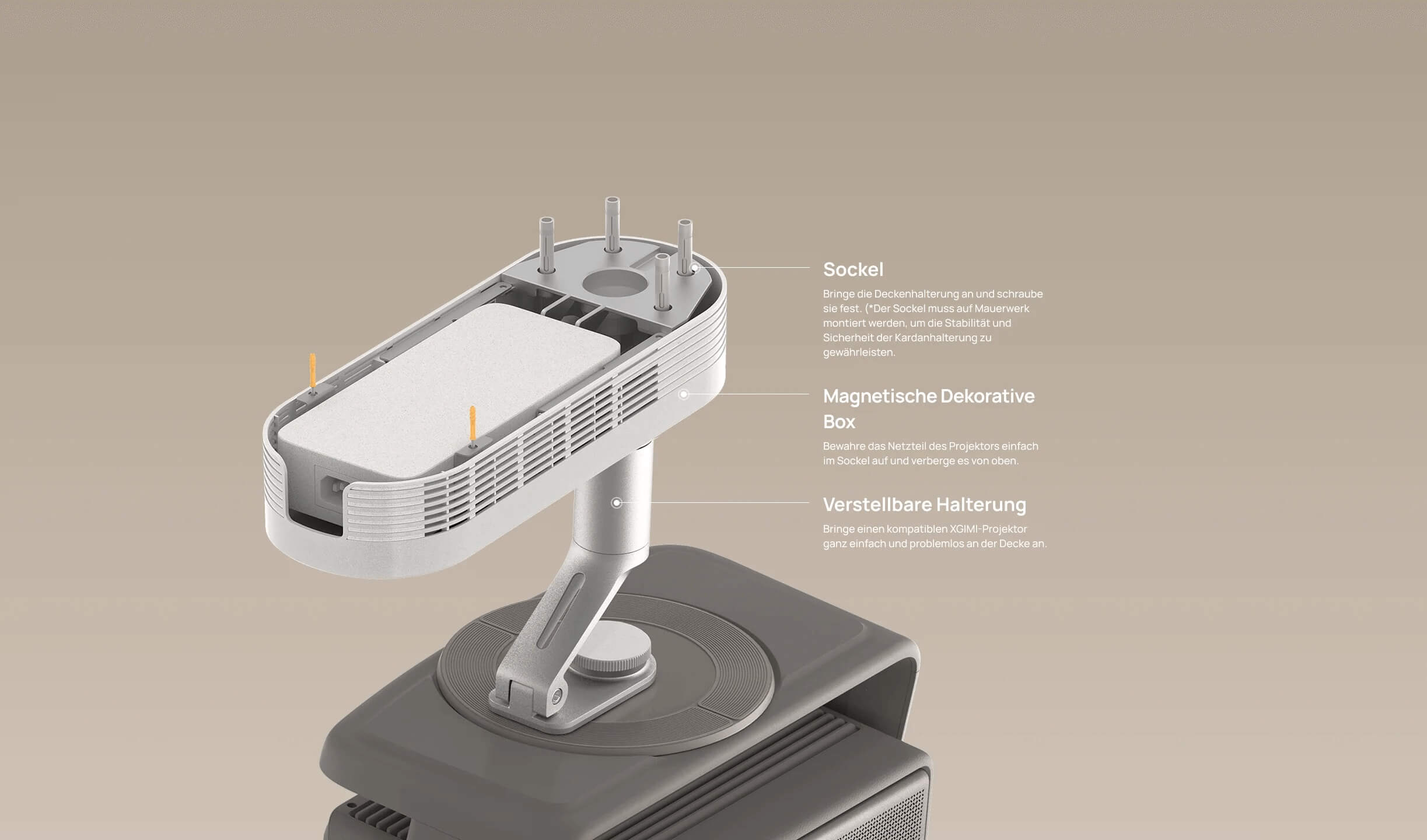 Die Halterung ist ausschließlich für Deckenmontage geeignet. Eine seitliche oder Bodenmontage wird nicht empfohlen. Achten Sie vor der Installation darauf, dass der Untergrund stabil ist, und folgen Sie der beiliegenden Installationsanleitung. Die XGIMI-Deckenhalterung wird inklusive Montageset geliefert – kein zusätzliches Zubehör erforderlich.